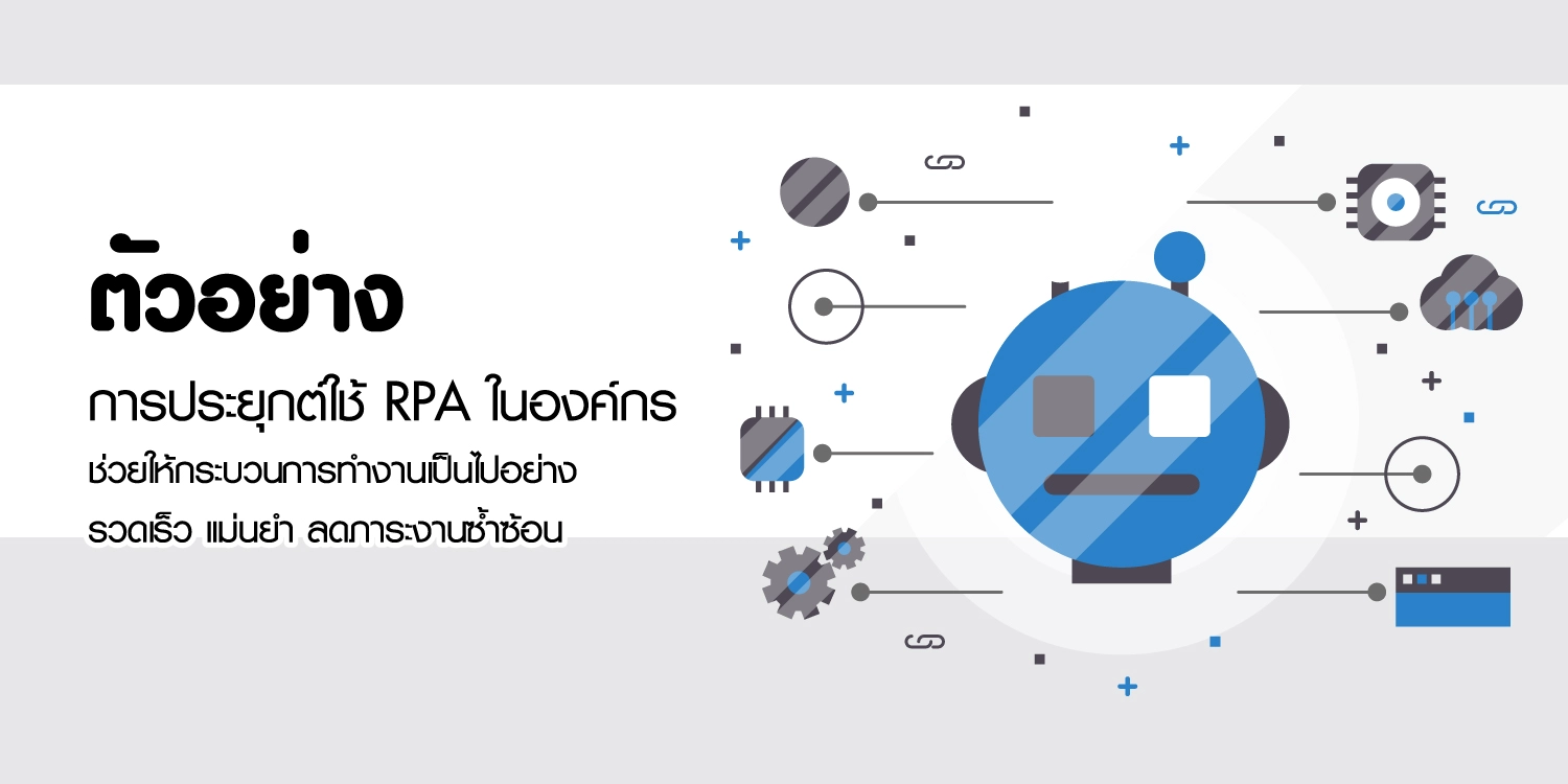 ตัวอย่าง RPA ที่ถูกนำมาใช้ในองค์กรช่วยให้กระบวนการทำงานเป็นไปอย่างรวดเร็ว แม่นยำ และลดภาระงานซ้ำซ้อน ด้วยความสามารถของเทคโนโลยี Robotic Process Automation สามารถทำงานแทนมนุษย์ในงานที่ต้องทำซ้ำ แต่ไม่จำเป็นต้องใช้การตัดสินใจที่ซับซ้อน เช่น การประมวลผลข้อมูล การจัดทำรายงาน และการตรวจสอบความถูกต้องของเอกสาร สามารถใช้งานได้ตั้งแต่แผนกบัญชี การเงิน HR การตลาด ซัพพลายเชน ไปจนถึงธนาคาร ลองมาดูกันว่ามีตัวอย่างการใช้งาน RPA รูปแบบใดที่สามารถช่วยให้ธุรกิจของคุณเติบโตได้บ้าง