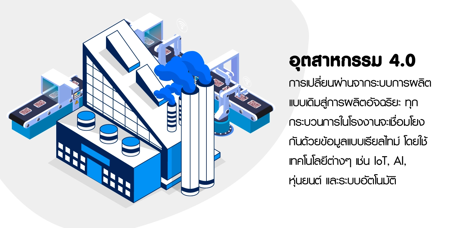 อุตสาหกรรม 4.0 คือการเปลี่ยนผ่านจากระบบการผลิตแบบเดิมสู่การผลิตอัจฉริยะ ทุกกระบวนการในโรงงานจะเชื่อมโยงกันด้วยข้อมูลแบบเรียลไทม์ โดยใช้เทคโนโลยีต่างๆ เช่น IoT, AI, หุ่นยนต์ และระบบอัตโนมัติ ทำให้โรงงานสามารถตอบสนองได้รวดเร็วขึ้น มีประสิทธิภาพมากขึ้น และปรับเปลี่ยนได้ตามสถานการณ์ตลาดอย่างยืดหยุ่น การสร้าง Smart Factory เป็นเป้าหมายสำคัญของ Industry 4.0 เพราะจะช่วยลดต้นทุน เพิ่มคุณภาพ และบริหารจัดการได้อย่างแม่นยำ