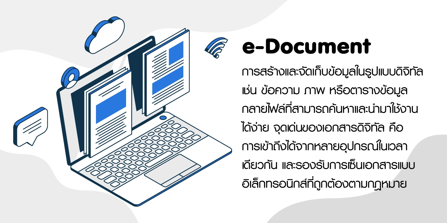 Electronic Document คือการสร้างและจัดเก็บข้อมูลในรูปแบบดิจิทัล เช่น ข้อความ ภาพ หรือตารางข้อมูล กลายไฟล์ที่สามารถค้นหาและนำมาใช้งานได้ง่าย จุดเด่นของเอกสารดิจิทัล คือการเข้าถึงได้จากหลายอุปกรณ์ในเวลาเดียวกัน และรองรับการเซ็นเอกสารแบบอิเล็กทรอนิกส์ที่ถูกต้องตามกฎหมาย ซึ่งช่วยให้ขั้นตอนการทำงานภายในองค์กรเป็นระบบมากขึ้นและลดความล่าช้าที่เกิดจากการใช้เอกสารกระดาษ